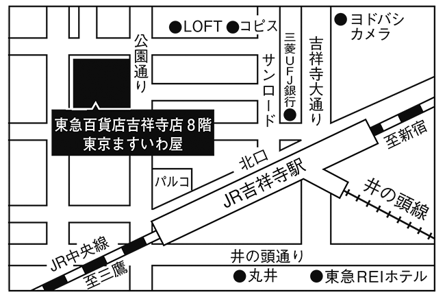 首都圏東京都東急百貨店吉祥寺店tokyomasuiwaya_kichijyojitokyuGoogle Maps 本社所在地〒180-8519 東京都武蔵野市吉祥寺本町2-3-1東京ますいわ屋東急百貨店吉祥寺店 電話番号0422-22-1910 営業時間10:00AM~8:00PM アクセス電車JR中央線・京王井の頭線 吉祥寺駅北口 徒歩5分 東北弘前店 甲信越・北陸ながの東急店 金沢エムザ店 首都圏銀座店 京王新宿店 調布パルコ店 東急百貨店吉祥寺店 玉川高島屋店 小田急町田店 たまプラーザ店 横浜ポルタ店 横須賀店 ODAKYU 湘南 GATE店 まるひろ川越店 グランエミオ所沢店 水戸店 まるひろ飯能店 FKD宇都宮店 高崎店 セレオ八王子店 中部名鉄名古屋店 四日市店 近畿あべのハルカス店 上本町店 守口店 奈良店 橿原店 和歌山店 四国高松店 九州熊本店 店舗一覧を見る